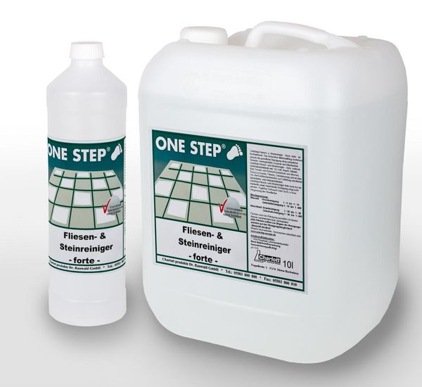 ONE STEP® Fliesen- und Steinreiniger forte ist ein hochkonzentrierter Reiniger und Entfetter und kann für die Reinigung von vielen Natur- und Kunststeinarten wie Marmor, Terrazzo, Granite, Kacheln, Fliesen, Feinsteinzeug, Fugen, etc. eingesetzt werden. Es ist u.a. ideal für den Großküchenbereich zur Entfettung sämtlicher Sicherheits- und Antirutschböden geeignet. Der höhere Anteil an hochwirksamen Inhaltsstoffen entfernt auch verhärtete alte Fettschichten.